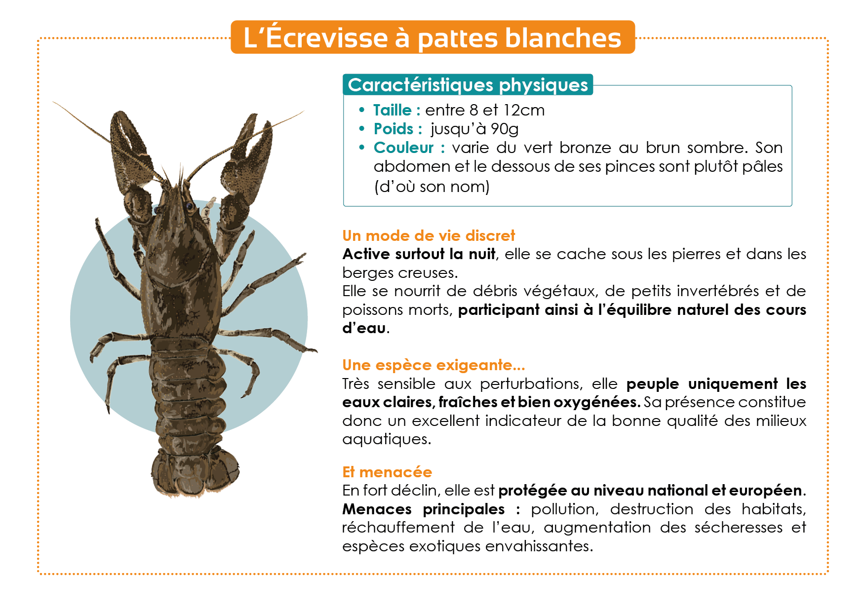 Dans le département de l’Ain, une seule espèce autochtone est présente : l’Ecrevisse à pattes blanches (Austropotamobius pallipes).